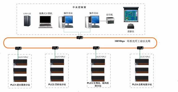 整個(gè)系統(tǒng)設(shè)1個(gè)中央控制室、4個(gè)現(xiàn)場PLC控制站組成,F(xiàn)場PLC控制站,由和利時(shí)公司LK冗余PLC系統(tǒng)及檢測儀表組成,對(duì)各工藝過程進(jìn)行分散控制;再由中央控制室(CCR),對(duì)全廠實(shí)行集中管理。中央控制室、PLC控制站之間的數(shù)據(jù)通訊采用高速的、實(shí)時(shí)的工業(yè)以太網(wǎng),網(wǎng)絡(luò)結(jié)構(gòu)為環(huán)形,通訊速率為100Mbps,傳輸介質(zhì)為光纖。