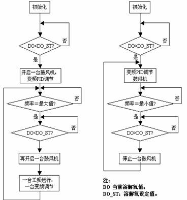 當(dāng)當(dāng)前溶解氧值小于設(shè)定值時(shí),開啟一臺(tái)鼓風(fēng)機(jī),并進(jìn)行變頻調(diào)節(jié);