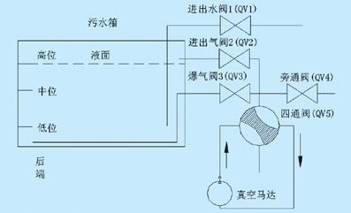 通過真空馬達(dá)對(duì)污水箱進(jìn)行抽真空,當(dāng)箱內(nèi)達(dá)到一定真空度時(shí),下水道中的污泥水通過管道開始吸入箱內(nèi);當(dāng)污水箱中的水位達(dá)到最高限位時(shí),液位傳感器反饋信號(hào)停止該動(dòng)作。