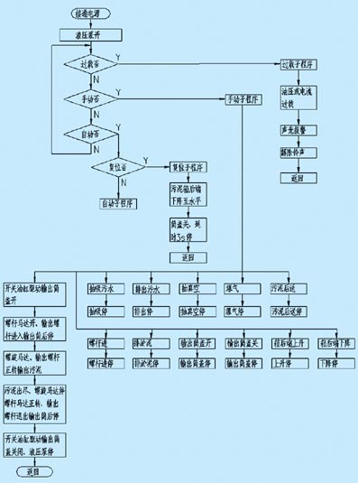 控制元件選用SIEMENS CPU224和EM223,設(shè)計(jì)輸入總點(diǎn)數(shù)為22點(diǎn),輸出總點(diǎn)數(shù)為22點(diǎn),現(xiàn)用的可編程控制器輸入總點(diǎn)數(shù)為30點(diǎn),輸出總點(diǎn)數(shù)為26點(diǎn),能夠滿足設(shè)計(jì)要求。反饋元件為選用正負(fù)壓差計(jì)、液位傳感器、磁性傳感器等。程序框圖見圖2、圖3所示。所編制的程序因篇幅太長(zhǎng)特省略。