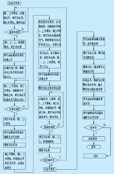 (6) 控制螺桿換向閥的左開、右開和斷電,驅(qū)動(dòng)油馬達(dá)完成螺桿輸送器進(jìn)入、退出污水箱及輸出污泥的工作;