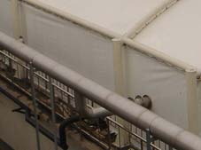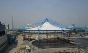 污水處理廠及垃圾填埋場(chǎng)的惡臭氣體污染治理的首先必須將造成污染的惡臭氣體收集。但是大型池體(如污泥氧化溝、初沉池、濃縮池等)的廢臭氣體收集是最難最大的問(wèn)題,由于絕大部分已建成的污水池在設(shè)計(jì)時(shí)未考慮池體加蓋密封,大跨度、耐腐蝕、施工安裝的可操作性等均是常規(guī)加蓋體難于克服的難題。鋼支撐反吊膜結(jié)構(gòu)采用了抗腐蝕能力很強(qiáng)的膜材把廢氣罩住,鋼結(jié)構(gòu)在外面將膜懸吊。這樣既發(fā)揮了膜材的抗腐蝕性能,又從根本上解決了鋼結(jié)構(gòu)由于與腐蝕性氣體接觸而帶來(lái)的腐蝕問(wèn)題,因而鋼結(jié)構(gòu)可以按普通建筑鋼結(jié)構(gòu)的防腐等級(jí)考慮進(jìn)行設(shè)計(jì),具有50年的使用壽命,發(fā)揮了鋼結(jié)構(gòu)的性能,實(shí)現(xiàn)了結(jié)構(gòu)骨架與覆蓋材料的完美結(jié)合。