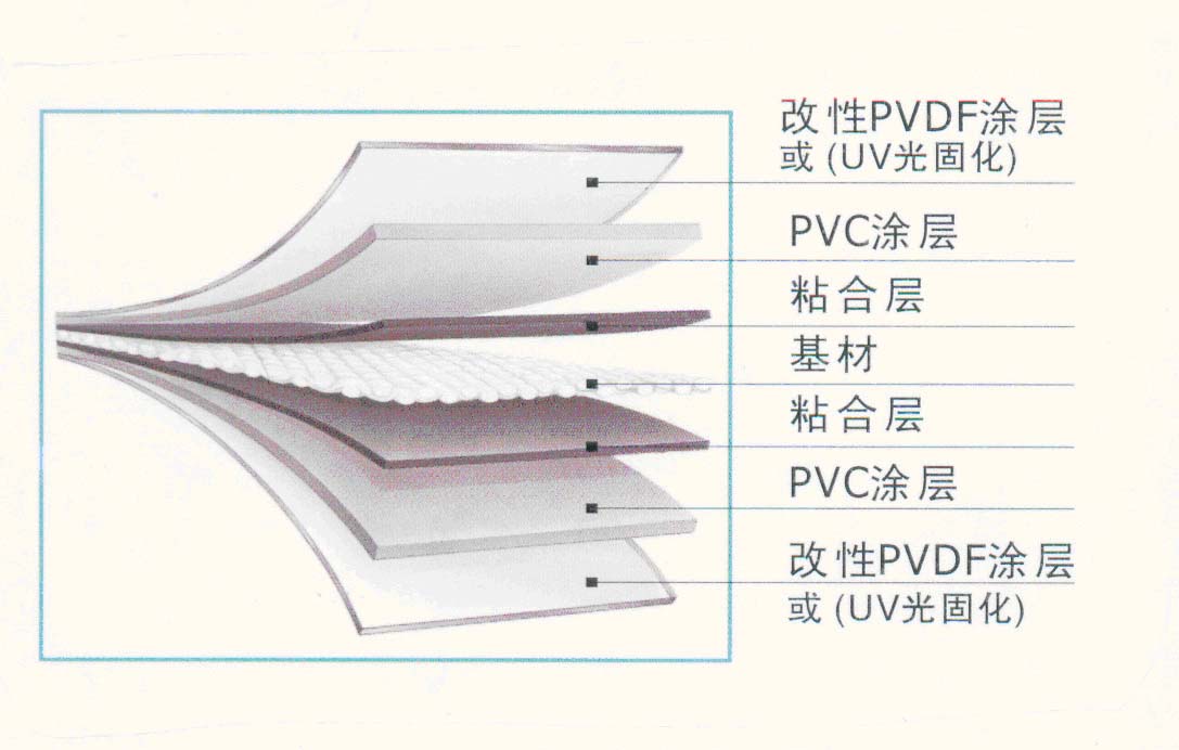 圖中“基材”為高張力聚酯纖維材料,膜材依靠它承受拉力。膜結(jié)構(gòu)所用膜材料由基布和涂層兩部分組成.基布采用聚酯纖維;涂層材料主要是聚氯乙烯。