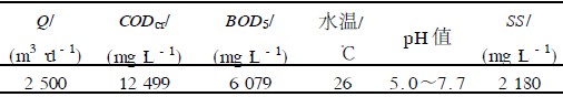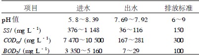 廢水在酸化反應(yīng)器中, CODcr由進(jìn)水的9680mg/L 降到出水的7958mg/L ,降低了18%。SS 由進(jìn)水的1162mg/L ,降到了出水的705mg/L ,降低了49% ,均達(dá)到了設(shè)計要求,進(jìn)一步改善了水質(zhì)。