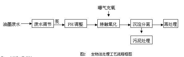 采用生物法處理PCB油墨廢水,一般采用接觸氧化法,但進(jìn)入生化槽的廢水的CODcr必須小于1000mg/L,一般要對PCB油墨廢水進(jìn)行預(yù)處理或稀釋,經(jīng)生物處理后出水CODcr可小于200mg/L。但生化處理需曝氣充氧,動力消耗大,處理費用也很高,而且該種廢水的可生化性較差。PCB油墨廢水中常含有一定量的重金屬離子,對生物具有毒害作用,大大降低了生物的活性。另外,其廢水pH值要嚴(yán)格控制于中性條件。PCB油墨廢水本身的一些固有特性(BOD與COD之比值太低,生化性太差),嚴(yán)重影響了生物法的應(yīng)用。生物法處理工藝如下: