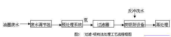 過濾-吸附法處理PCB油墨廢水,先將廢水預(yù)處理后由泵打入過濾器,廢水經(jīng)過濾器處理后可去除大部分的油墨及懸浮物,過濾出水進(jìn)入活性炭吸附設(shè)備,通過活性炭的吸咐、分解作用,能達(dá)到很好的處理效果。但采用此工藝處理PCB油墨廢水,活性炭很易飽和,處理率較低,運行成本較高,另外,由于廢水中的油墨粘性較大,容易粘在管路、設(shè)備上,設(shè)備故障率高,此工藝不便采用。過濾-吸附法工藝如下: