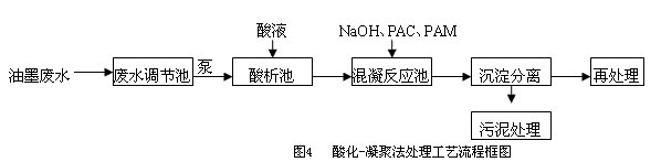 我們在工程實踐中根據(jù)油墨廢水的特點,并結(jié)合國內(nèi)的實際情況,考慮到處理工藝的實際可行性,結(jié)合對不同廠家的油墨廢水小試的結(jié)果,主要采用酸析——凝聚法來處理油墨廢水,并在工程實踐中對工藝進(jìn)行了改進(jìn)和完善,我們先后采用了四種處理工藝: