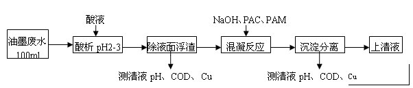 A、 分別取每個廠家的油墨廢水(在油墨廢水收集槽直接取混合液,混合液由不同的生產(chǎn)線排出的各種油墨廢水混合而成)各100ml于燒杯中,測其原水pH值、CODcr和Cu;