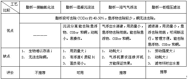 以上四種工藝我們先后應(yīng)用于不同工程中,酸析單元主要去除大部分的菲林類物質(zhì),酸析除渣后廢水懸浮物仍很高,CODcr去除率僅40-50%,還需進(jìn)一步凝聚分離除CODcr、SS和銅等,根據(jù)工程實踐經(jīng)驗,以下對四種工藝優(yōu)劣點進(jìn)行比較。