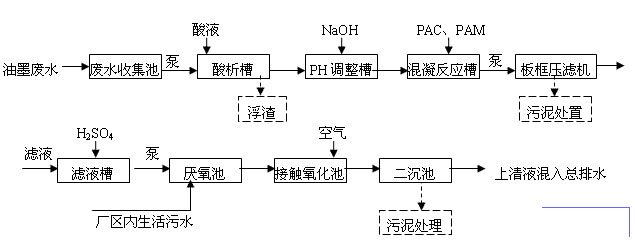 A、油墨廢水 酸析(除浮渣) 濾袋過濾 pH調(diào)整 接觸氧化 沉淀分離 上清液