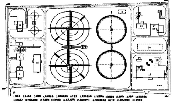 黃村污水處理廠位于縣城東側,通黃路北側的鳳河與減河之間,按照少占農田和降低工程投資的設計原則,選擇處理構筑物形式和進行廠區(qū)平面布置。本廠分為三個功能區(qū),首先是污水機械處理區(qū)及污泥處理區(qū),本區(qū)有粗、細格柵產生的柵渣,沉砂池的砂礫和污水處理過程中產生的污泥,衛(wèi)生條件較差。把這類處理構筑物集中起來可以減少衛(wèi)生隔離占地,并可改善個廠區(qū)的衛(wèi)生環(huán)境,其次是生物處理區(qū),即氧化溝和二沉池,國內普遍認為氧化溝工藝占地面積大,其主要原因是氧化溝泥齡長容積大,而由于曝氣設備的原因其水深較小。本廠采用了奧貝爾氧化溝,其水力條件好,曝氣設備選項用曝氣轉碟,不僅提高了曝氣設備的充氧效率,而且也提高了攪拌能力,據有關資料介紹,水深4.3 米時池底水平均流速仍大于0.3米/ 秒, 沒有污泥沉淀現象, 因而本廠的奧貝爾氧化溝水深加大到4.20--4.25 米,使氧化溝占地面積大大降低;二沉池是保證出水水質達標的重要構筑物,通過技術措施在保證出水水質要求的前提下,設計采用兩座大直徑輻流式沉淀池,使沉淀池占地面積降低,同時運行管理簡捷明快;再次是生產輔助區(qū)和生活區(qū),本區(qū)位于夏季主導風向上游,與衛(wèi)生條件好的二沉池相鄰,遠離衛(wèi)生條件差的污泥區(qū)和機械處理區(qū)。廠區(qū)平面布置見圖2,占地面積僅4.80 公頃,遠低于國標要求。