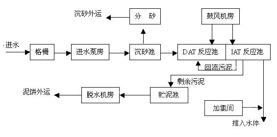 DAT-IAT系統(tǒng)的主體構(gòu)筑物由一個(gè)連續(xù)曝氣池和一個(gè)間歇曝氣池串連而成。一般情況下,DAT連續(xù)進(jìn)水、連續(xù)曝氣,其出水連續(xù)流入IAT,在IAT完成反應(yīng)、沉淀、出水等工序。其典型工藝流程如圖所示。