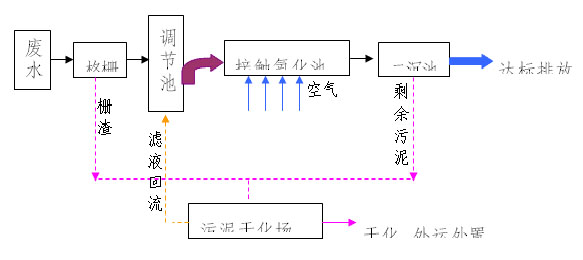 剩余污泥、柵渣進入污泥井,然后用污泥泵提升到污泥干化場,經(jīng)自然干化脫水后外運處置。干化脫水產(chǎn)生的濾液回流到調(diào)節(jié)池,再通過處理系統(tǒng)處理。