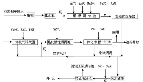 廠區(qū)內(nèi)各路制革污水經(jīng)格柵后進(jìn)入集水池;再由泵提升至預(yù)曝氣調(diào)節(jié)池,此池中視水質(zhì)情況投加Ca(OH)2(調(diào)節(jié)pH在8~9之間,一般勿需調(diào))、MnSo4進(jìn)行催化氧化脫硫;再泵至豎流式沉降器,管道混合投加FeSO4和PAM-,使S2-形成FeS↓沉淀,Cr3+形成Cr(OH)3↓,去除絕大部分SS、S2-和Cr3+;上清液自流入一體化氣浮裝置,在攪拌作用下依次投加適量液堿、PAC、PAM-,徹底去除細(xì)小SS和Cr(OH)3微絮體,確保生化進(jìn)水水質(zhì);出水用管道泵提升至強(qiáng)化活性污泥池,大幅度去除溶解性的有機(jī)物;然后再自流入斜板二沉池,視水質(zhì)情況投微量PAC和PAM-,確保出水達(dá)標(biāo)排放。二沉污泥大部分回流至生化池補(bǔ)充菌種,剩余污泥同初沉、氣浮污泥一并進(jìn)入污泥儲(chǔ)池,再由帶式壓濾機(jī)脫水后外運(yùn)妥善處置。