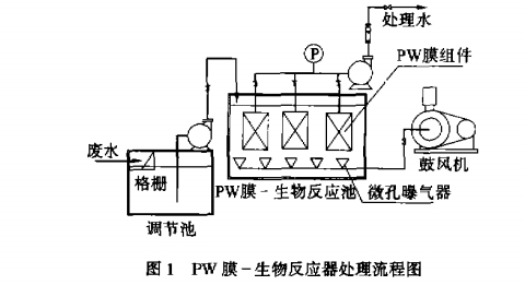 PW—W膜生物反應(yīng)器將膜組件安裝在生物反應(yīng)器中,底部安裝有微孔曝氣器,通過曝氣裝置出來的氣液混合流作為折向過濾流程來實(shí)現(xiàn)過濾和清洗膜表面,其處理流程可用圖1表示。