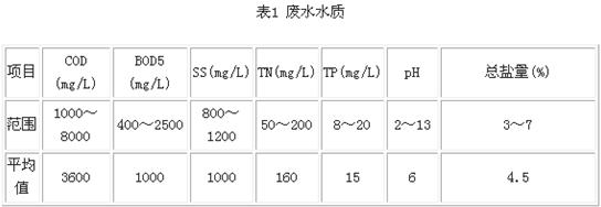 該工程處理的廢水為制藥廠排放的綜合性生產(chǎn)廢水,廢水中含有維生素類、激素類和抗生素類等多種原料藥殘余物、醫(yī)藥中間體殘余物、鹽類及生產(chǎn)過程中產(chǎn)生的其他有機(jī)物。這些廢水水質(zhì)具有成分復(fù)雜、有機(jī)物濃度高、pH值變化大、懸浮物多、色度大、總鹽量高等特點(diǎn),并且廢水中還含有大量難生物降解物質(zhì)和對(duì)微生物有抑制作用的有毒有害物質(zhì)。廢水水質(zhì)如表1所示。