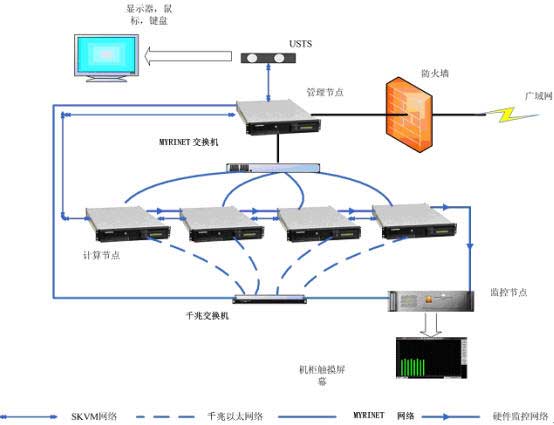 TC4000機(jī)群系統(tǒng)通過四套網(wǎng)絡(luò)(MYRINET計算網(wǎng),千兆管理網(wǎng),SKVM網(wǎng)。IIC監(jiān)控網(wǎng))將管理節(jié)點、計算節(jié)點以及控制設(shè)備和監(jiān)控設(shè)備連接起來,組成了一個充滿活力的機(jī)群系統(tǒng)。其中,千兆管理網(wǎng)提供了絕大多數(shù)的管理功能及以外部連接,用戶可以通過千兆網(wǎng)絡(luò)連接到管理節(jié)點從而使用整個機(jī)群系統(tǒng),同時,千兆管理網(wǎng)還能確保在MYRINET網(wǎng)出現(xiàn)故障時繼續(xù)提供不間斷的計算服務(wù)。此外,管理監(jiān)控網(wǎng)絡(luò)采用基于硬件采集的監(jiān)控系統(tǒng),不占用系統(tǒng)資源,做到主板級的監(jiān)控。加之曙光獨(dú)有的SKVM網(wǎng)絡(luò)使得管理節(jié)點,用戶可以在幾百米以外對系統(tǒng)進(jìn)行管理。