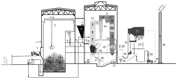 爐渣由出渣口進入滾筒式冷渣機,經(jīng)冷卻并篩選后,細渣由砂石提升機經(jīng)星形閥返送入爐膛,補充床料高度;粗渣經(jīng)斗式輸送帶,送入渣倉,由汽車運走。除塵后的飛灰經(jīng)中間灰倉由氣泵打入灰倉,經(jīng)調(diào)濕后,由汽車運走,填埋處理或制磚。