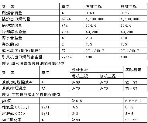 有關(guān)運行、設(shè)計資料見表1。海水脫硫系統(tǒng)性能保證設(shè)計值、實測值見表2、表3。