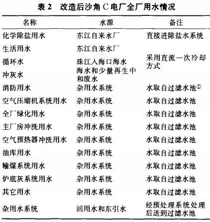 廢水系統(tǒng)改造的目的就是對表1中的可利用廢水進行回收并深度處理,對處理后的廢水重新進行合理的利用。電廠原生水系統(tǒng)取自東引水,經(jīng)預(yù)處理系統(tǒng)處理后供應(yīng)全廠雜用水、除鹽用水和生活用水。后由于東引水污染嚴重,化學(xué)除鹽水和生活用水改為自來水作水源。在廢水回用工程實施后,回用水只作為全廠的雜用水水源,不足部分由東引水補充。改造后電廠的用水狀況見表2。