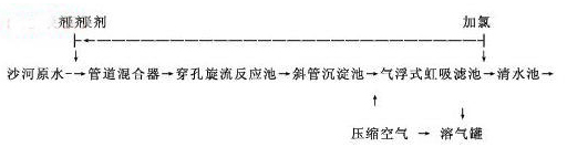 1995年初,在小試的基礎(chǔ)上,通過將原虹吸濾池的6個(gè)濾格均改造為氣浮式虹吸濾池,實(shí)現(xiàn)了混凝沉淀-氣浮過濾的新工藝,流程如下: