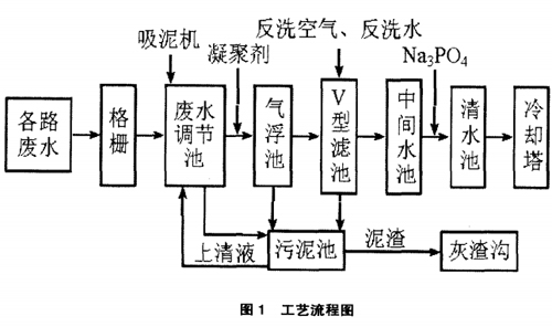 各路廢水通過格柵匯集到調(diào)節(jié)池中,在調(diào)節(jié)池頂設(shè)吸泥機(jī),廢水在調(diào)節(jié)池內(nèi)初步沉淀后,由廢水提升泵送人氣浮池。在氣浮池進(jìn)水管投加凝聚劑,廢水中膠體和微小懸浮物通過混凝反應(yīng)生成小顆粒礬花,被細(xì)微氣泡攜帶浮上水面,由刮渣機(jī)刮除,而清水則由氣浮池下部集水管匯集自流進(jìn)人V型濾池。V型濾池濾后水進(jìn)人中間水池,通過中間水泵送人清水池,在中間水泵出口投加Na3PO4調(diào)整清水pH值。最終產(chǎn)品水由清水泵送至工業(yè)循環(huán)冷卻水池。