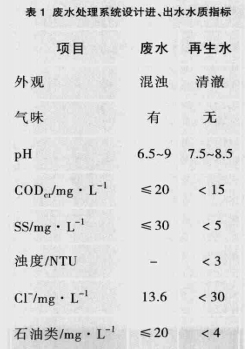 (2)防止產(chǎn)生生物污泥,使系統(tǒng)中銅管發(fā)生堵塞或產(chǎn)生污泥下的腐蝕,主要應(yīng)控制COD、懸浮物和細(xì)菌的數(shù)量。由表1可見,廢水中的cl-已達(dá)到回用要求,可不必考慮。經(jīng)現(xiàn)場調(diào)研得知,電廠定期在工業(yè)循環(huán)水中投加殺菌劑,則再生水中細(xì)菌數(shù)量也不必考慮。因此,本工程主要處理對象是廢水的pH、COD和懸浮物。經(jīng)過詳細(xì)論證、分析,確定工藝流程如圖1所示。