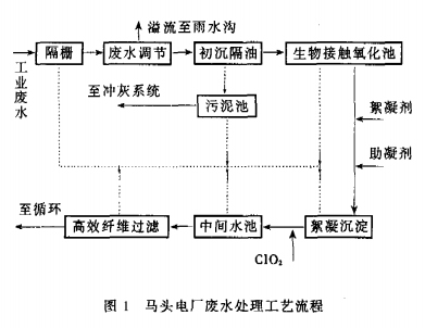 廢水調(diào)節(jié)池出水進(jìn)入初沉隔油池去除部分懸浮物、油及COD。隔油池出水自流進(jìn)入生物接觸氧化池。浮游物、污泥進(jìn)入污泥池,然后排入沖灰系統(tǒng)。在生物接觸氧化池中,好氧微生物對污水中的有機(jī)物進(jìn)行氧化分解,去除絕大部分的溶解性有機(jī)物(BOD)及部分油類。生物接觸氧化池出水進(jìn)入絮凝沉淀池,廢水中的微小絮體在絮凝劑和助凝劑的吸附中和、架橋卷掃作用下進(jìn)行固液分離,去除部分COD以及大部分懸浮物。