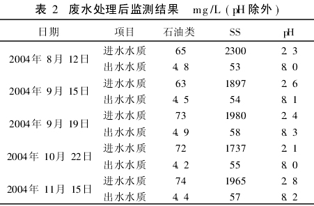 該設(shè)備于2004年5月安裝完畢,2004年6月開(kāi)始進(jìn)水調(diào)試運(yùn)行,8月通過(guò)環(huán)保驗(yàn)收。運(yùn)行至今表明,各項(xiàng)污染物均達(dá)到廣東省地方標(biāo)準(zhǔn)《水污染物排放限值》(DB44/26-2001)第二時(shí)段一級(jí)標(biāo)準(zhǔn),其監(jiān)測(cè)數(shù)據(jù)見(jiàn)下表。