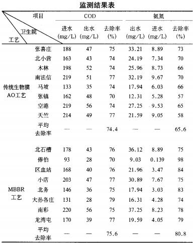 以北京市順義區(qū)各鄉(xiāng)鎮(zhèn)衛(wèi)生院產(chǎn)生的醫(yī)療廢水多為生活污水,處理水量為25~50m3/d,2005年至2007年針對順義區(qū)的張喜莊、北小營、木林、南法信、馬坡、張鎮(zhèn)、空港、天竺、北石槽、俸伯、區(qū)血站、小店、北務(wù)、大孫各莊、南彩、龍灣屯等衛(wèi)生院的污水進(jìn)行了處理,其中前八個衛(wèi)生院采用傳統(tǒng)生物膜A/O工藝,后八個單位采用MBBR工藝。工藝前端均設(shè)格柵和調(diào)節(jié)池,后端采用豎流式沉淀池和二氧化氯消毒。使用傳統(tǒng)生物膜AO工藝的污水處理站中的A池水力停留時間為4h,O池水力停留時間為6h,回流比100%,彈性填料填充比75%,氣水比15:1。