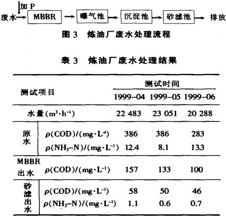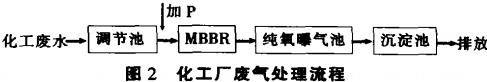 美國一化工廢水處理廠擴建工程,用MBBR法代替老的滴濾池。新建MBBR廢水設(shè)施占地面積僅為223m。MBBR出水直接流入純氧活性污泥系統(tǒng)。處理流程見圖2。