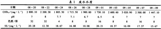 生產(chǎn)排水的COD一般為1500-3000mg/L,通過膜處理后,出水的COD不能達標,水質波動較大。我們對該公司預處理后的生產(chǎn)廢水進行取樣分析,除其COD嚴重超標外,其他指標均達到排放要求,其廢水水質見表1。