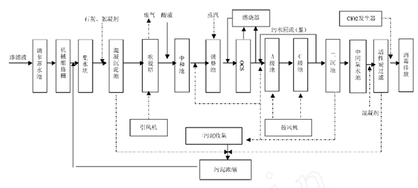 垃圾滲濾液首先經(jīng)調(diào)節(jié)蓄水池收集,出水經(jīng)機(jī)械格柵攔截后能過提升泵提升至混凝沉淀池,經(jīng)加藥混凝沉淀,去除重金屬、SS和部分有機(jī)污染物;炷恋沓爻鏊帽锰嵘涟钡得撍コ糠职钡,使氨氮含量降低至不抑制后續(xù)生化處理的程度。氨氮吹脫塔出水由調(diào)整池收集,調(diào)節(jié)PH值后用泵提升至加熱交換器,經(jīng)加熱后進(jìn)入QCS厭氧反應(yīng)器。QCS厭氧反應(yīng)器出水自流至厭氧結(jié)合AΠO接觸氧化池進(jìn)行生化處理。出水經(jīng)沉淀后采用混凝過濾和消毒處理,使之全面達(dá)到國家要求的二排放標(biāo)準(zhǔn)達(dá)標(biāo)排放。工藝中增加了一級應(yīng)急吸附器應(yīng)付特殊情況。