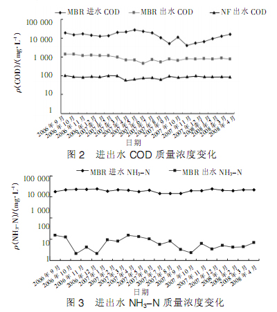BR系統(tǒng)出水的COD質(zhì)量濃度一直在1500mg/L以下,而運(yùn)行后期出水則穩(wěn)定在1000mg/L以下。整個(gè)運(yùn)行期間MBR的平均出水COD質(zhì)量濃度為945mg/L,平均COD去除率為94.6%。NF系統(tǒng)穩(wěn)定運(yùn)行后出水均能保持在100mg/L以下,均值為80mg/L,NF平均COD去除率達(dá)91.5%。系統(tǒng)總體COD去除率達(dá)99.5%。NH3-N的凈化主要通過MBR的生化凈化過程來實(shí)現(xiàn),由于MBR能夠截留增殖緩慢的硝化細(xì)菌,大大提高了系統(tǒng)的硝化能力,MBR出水NH3-N質(zhì)量濃度平均為6.9mg/L,已達(dá)到了排放標(biāo)準(zhǔn)。生化過程的NH3-N去除率高達(dá)99.5%。NF出水TN和TP質(zhì)量濃度平均為57mg/L和0.5mg/L,達(dá)到了排放標(biāo)準(zhǔn)。