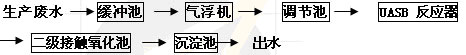 車間的生產(chǎn)廢水首先收集至緩沖池(原有,有效容積為50 m3。工程實施時,新建一緩沖池,有效容積為130 m3),然后經(jīng)過氣浮反應(yīng)設(shè)備預(yù)處理,去除污水中部分懸浮物和一部分高分子物質(zhì)。氣浮處理后的廢水進入集水池(原有),由提升泵提升至UASB反應(yīng)器中進行厭氧分解,去除大部分COD并將難生物降解的大分子物質(zhì)分解為易生物降解的小分子物質(zhì)。分解后的廢水自流進入調(diào)節(jié)池與生活污水及原系統(tǒng)厭氧反應(yīng)池出水混合;旌虾蟮膹U水由污水提升泵提升至脫泡塔去除表面活性劑。經(jīng)脫泡塔處理后的廢水進入二段生物接觸氧化池,內(nèi)分A段、中沉池、B段,在A段、B段安裝組合填料,底部安裝微孔曝氣器。經(jīng)過鼓風充氧的廢水與長滿生物膜的填料相接觸,在生物膜的作用下,廢水得到凈化。二段生物接觸氧化池的出水自流進入二沉池。二沉池出水達標排放。UAS反應(yīng)器、中沉池和二沉池中的剩余污泥除回流部分外,其余排至現(xiàn)有污泥處理系統(tǒng)統(tǒng)一處理。
