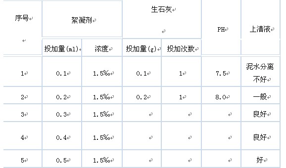 3月18日上午在龐博和曹工的指導(dǎo)下,我們決定對(duì)2#氧化溝系列采用投生石灰和絮凝劑來(lái)控制氧化溝內(nèi)因污泥膨脹產(chǎn)生的褐色泡沫,投生石灰是為了殺死活性污泥中的絲狀菌(利用絲狀菌不能在堿性環(huán)境中生存的原理),投絮凝劑是為了增加活性污泥的沉降性能。首先做小試,確定生石灰和絮凝劑投加量,取2#氧化溝內(nèi)混合液1000ml,首加0.1g生石灰,測(cè)PH值為7.7,再加0.1g生石灰攪拌,測(cè)PH為8.03,小試后確定每升混合液中加0.2g生石灰,換算為每方0.2kg;然后向混合液中加1.5‰的絮凝劑從0.1ml開始加至0.5ml時(shí),混合液的泥水分離較好,上清液變清亮,換算為每方混合液加1.5‰的絮凝劑0.5 kg。