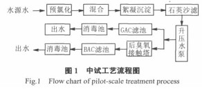 中試裝置包括預(yù)處理、常規(guī)處理和深度處理三部分。深度處理工藝總進(jìn)水量為5m3/h, GAC 和BAC工藝各占2.5m3/h。其中預(yù)加氯采用水射器投加;GAC和BAC 炭濾池規(guī)格相同,池高為4.2m,平面尺寸為 510mm×510mm,采用ZJ-15型柱狀炭,碘值大于900mg/g,亞甲藍(lán)值大于150 mg/g,直徑1.5mm,炭層厚2m;后臭氧接觸塔總?cè)莘e為0.42m3,設(shè)置2 級(jí) 接觸,第一柱容積 0.097m3,直徑Φ150mm,塔高6m,有效水深5.5m,第二柱容積0.35m3