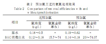 結(jié)合沙口水廠的生產(chǎn)實(shí)際情況, 在該研究中也采用了預(yù)加氯工藝。但預(yù)加氯條件下, 若余氯過(guò)高有可能殺死部分微生物或抑制部分微生物的活動(dòng),影響生物活性炭的凈水效能。為確定預(yù)加氯工藝是否會(huì)較大地影響 BAC的氨氮的去除效果, 先進(jìn)行了預(yù)加氯和無(wú)預(yù)加氯的對(duì)比試驗(yàn),預(yù)加氯條件下, 嚴(yán)格控制沉淀池出水余氯≤0.1mg/L。試驗(yàn)結(jié)果如表 2。
