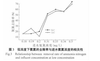 圖 3 低濃度下氨氮的去除率與進(jìn)水氨氮濃度的相關(guān)性所降解,其后再加氯消毒, 降低了產(chǎn)生消毒副產(chǎn)物的危險(xiǎn)。但從經(jīng)濟(jì)角度等綜合考慮,建議優(yōu)先采用GAC 工藝。