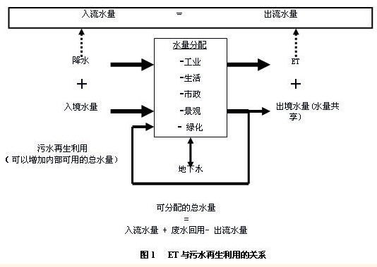 廢污水作為水資源系統(tǒng)的一個(gè)組成部分,通過(guò)城市水資源的優(yōu)化配置,為城市工業(yè)、河湖景觀、綠化以及農(nóng)業(yè)灌溉等對(duì)水質(zhì)要求較低的行業(yè)或部門提供了穩(wěn)定的水源,在解決城市水資源供需緊張方面發(fā)揮了重要的作用,一直以來(lái)被認(rèn)為是城市節(jié)水的主要措施之一。然而,工業(yè)(火電、鋼鐵等)、河湖景觀、綠化以及農(nóng)業(yè)灌溉等是ET產(chǎn)生較多部門和行業(yè),污水再生利用的過(guò)程中不可避免的要產(chǎn)生大量的ET。在水資源總量不變的前提下,污水再生利用是通過(guò)加大水資源開發(fā)利用的程度,增加本地區(qū)水資源的消耗量,而提高了一個(gè)城市或一個(gè)地區(qū)的水資源的保證率,并非真實(shí)意義的節(jié)水,如圖1所示。