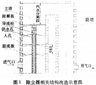在保留現(xiàn)有除塵器及系統(tǒng)不變的情況下,我們采用了由華中理工大學(xué)等開發(fā)的新型麻石麻旋流板煙氣凈化技術(shù),在筒體內(nèi)增設(shè)了相關(guān)結(jié)構(gòu)(如圖1示),使該除塵器改造簡單,投資少,見效快。