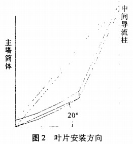 (2) 在筒體內(nèi)增設(shè)3層旋流板,以強(qiáng)化氣流旋轉(zhuǎn)運(yùn)動(dòng)。旋流板葉片由麻石制成,葉片在主塔簡體上的安裝傾角20 °(如圖2) 。旋流板主要支撐在導(dǎo)流柱上,并可以利用簡體來輔助支撐,每層旋流板由8塊葉片組成,層與層之間的距離約980ram(如圖1)。