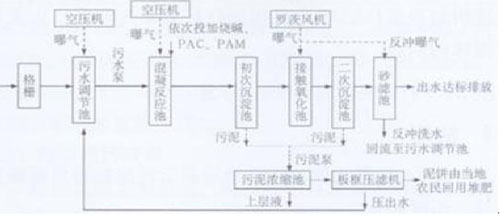 由于該制藥廢水的可生化性較差(BOD5/CODcr(<0.2),有機物濃度、懸浮物含量和色度均較大,并含有難生物降解的大分子有機物,水質(zhì)成分復(fù)雜,因此,該廢水處理工藝的設(shè)計應(yīng)先采用混凝反應(yīng)沉淀預(yù)處理法去除廢水中大部分難生物降解的大分子有機物、懸浮物和色度,以減輕后續(xù)處理的負(fù)荷,并提高廢水的可生化性,再利用生物接觸氧化法有效地去除廢水中的有機污染物。廢水處理的工藝流程如下圖所示。