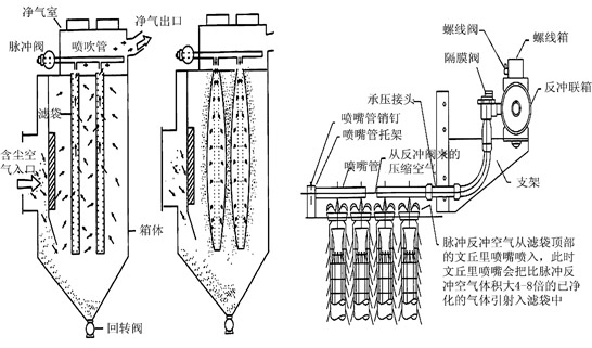 脈沖清灰袋式除塵器工作原理示意圖 |