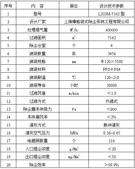 袋式除塵器是利用纖維對粉塵進行過濾而使煙氣得到凈化的除塵設備。鍋爐尾部煙氣從袋式除塵器進口煙箱進入煙氣室,首先經過煙氣分配裝置,對煙氣中大顆;伊_M行初步分離、降低煙速和均布煙氣;煙氣進入濾袋進行外過濾,粉塵就被阻留在布袋外面,凈化后的煙氣由布袋上出口進入凈氣室,由出口煙箱經引風機從煙囪排入大氣;為了減少除塵阻力,保證正常運行,濾袋上方裝有壓縮空氣噴吹系統(tǒng),每條濾袋上方都有對應的噴吹孔,采用文丘里噴嘴使20%壓縮空氣和80%被凈化的氣體組成脈沖氣流,通過高壓脈沖控制系統(tǒng)進行清灰,收集到的粉塵落入小灰斗,進入原有的干式或水力除灰系統(tǒng)。當鍋爐啟停投油助燃或事故處理狀態(tài)下,通過自動或手動方式將煙氣切換到旁路煙道,關閉出、入口提升閥,解列除塵器以保護濾袋。