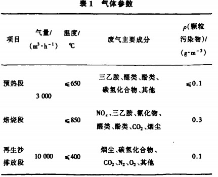 該公司廢氣最大排放量:約13 000 m3/h,其中預(yù)熱和焙燒段廢氣量約3 000 m3/h,再生砂排放單元廢氣量約10 000 m3/h。廢氣參數(shù)見表1。