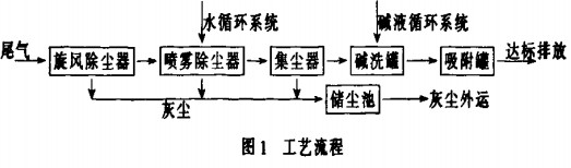 1)除塵系統(tǒng)。工藝根據(jù)廢氣含塵量大的特點,設(shè)計采用了三級除塵系統(tǒng),分別是旋風除塵、噴霧除塵和集塵器除塵。以保證進入堿洗罐中的塵土含量滿足設(shè)計要求,不影響堿洗吸收效果。