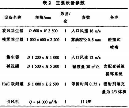 3)廢氣HAC吸附裝置。系統(tǒng)采用HAC吸附材料,其不同于傳統(tǒng)的吸附式廢氣處理設(shè)備采用的顆;钚蕴(GAC)。HAC是由一定配比的吸附劑材料和粘接劑組成,經(jīng)過一定的制備工藝形成獨特的活性炭纖維與蜂窩狀活性炭組成的組合吸附材料。它具有阻力小、結(jié)構(gòu)合適、孔徑分布合理、濕度影響小、吸附性能好的特點。其主要設(shè)備參數(shù)見表2。