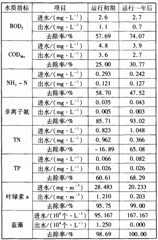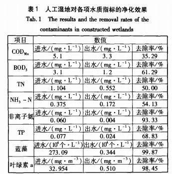 2001年9月—2004年5月人工濕地的平均進(jìn)水水質(zhì):BOD5為3.1mg/L,CODM為5.1mg/L,TP為0.077mg/L,TN為1.104mg/L,藍(lán)藻為273.09X10個(gè)/L,葉綠素a為32.95mg/m3,非離子氨為0.060mg/L。