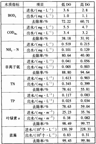 ③系統(tǒng)連續(xù)運(yùn)行了32個(gè)月,經(jīng)歷了四季、進(jìn)水pH值和DO值的變化。冬季的平均水溫和氣溫較低,對(duì)污染物的去除率相對(duì)較低;進(jìn)水pH值呈中性偏堿對(duì)非離子氨的凈化效果較好,而pH值低對(duì)BOD、TN、NH一N、TP的凈化效果較好。